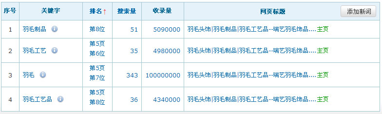 網站名稱:廣州瑞藝羽毛飾品有限公司網址:www.feather-ruiyi.com推廣關鍵詞:羽毛頭飾、羽毛制品、羽毛工藝品關鍵詞在百度排名數據