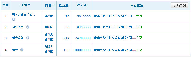 網站名稱:佛山市隆韋制冷設備有限公司網址:http://www.lwzlsb.com/關鍵詞:制冷公司、制冷設備、制冷服務類型:收費(2000元/年)關鍵詞在百度排名數據: