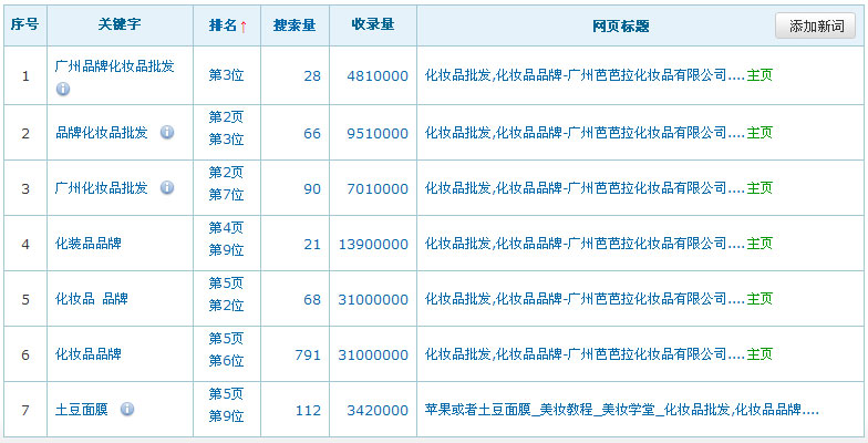 網(wǎng)站名稱:廣州芭芭拉化妝品有限公司網(wǎng)址:http://www.gzbba.com/關(guān)鍵詞:化妝品批發(fā),化妝品品牌服務(wù)類型:收費(fèi)(2500元/年)關(guān)鍵詞在百度排名數(shù)據(jù):